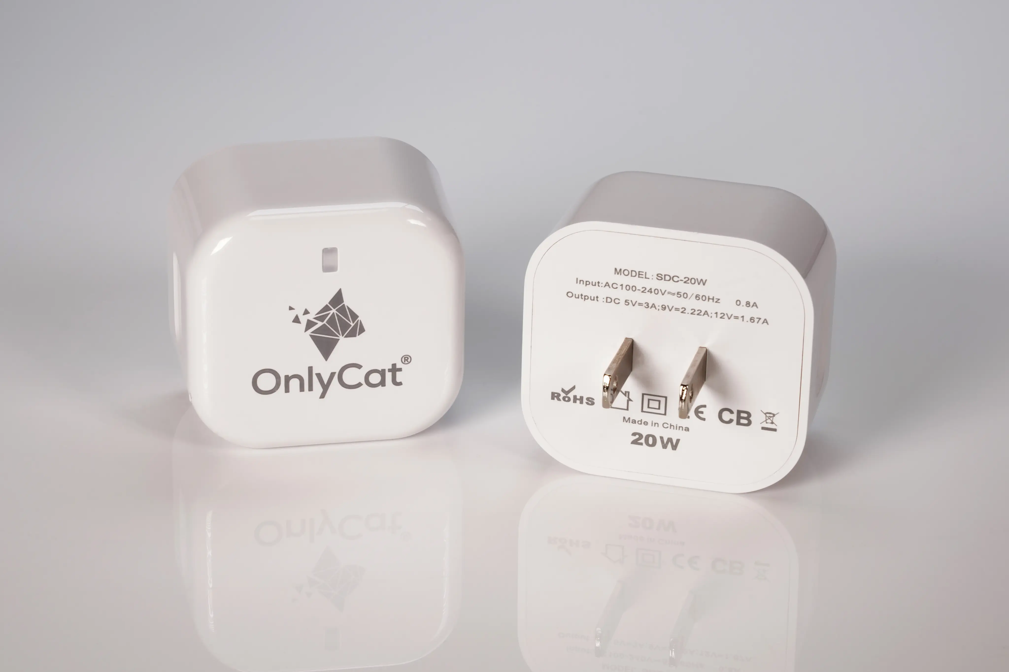 Ein Ersatz-OnlyCat markierter Stromadapter. Kompakt, USB-C Power Delivery (PD), 20W.