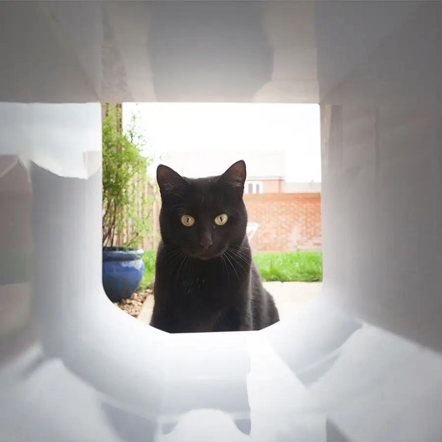 We’ve discovered through this project that cats are basically human brains with fur… and as such, some cats will work out how to push down on the lock with one paw, and pull the cat flap open with the other.